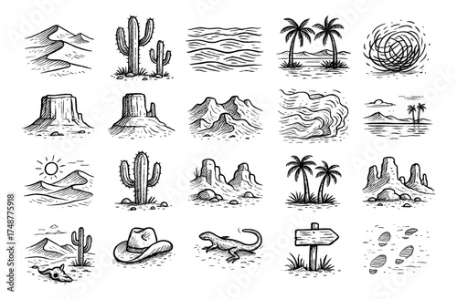 Fototapeta premium Hand-drawn desert elements with cacti, mountains, and wild west symbols