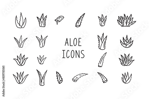 Fototapeta premium Hand drawn doodle aloe vera outline icon set