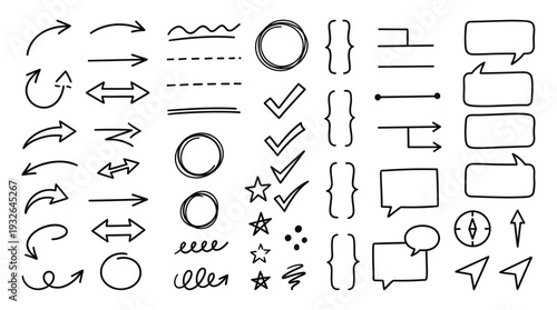 Obraz premium Hand drawn doodle arrows, lines, speech bubbles and check marks vector set
