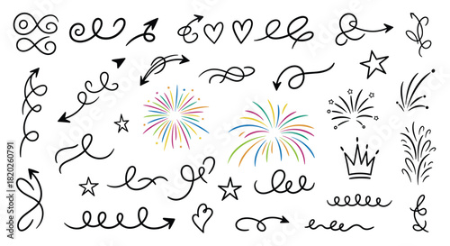 Naklejka premium Hand-drawn doodle elements collection featuring diverse arrows, decorative swirls, hearts, stars, festive fireworks, and a crown, ideal for creative projects.