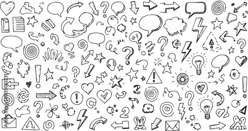© HexaFrame, Obraz premium Hand drawn doodle elements collection with arrows speech bubbles and question marks.