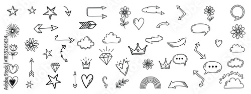 © Hafiz, Naklejka premium Hand Drawn Doodle Elements Set With Star, Flower, Arrow, Cloud, Diamond, Heart, Crown, Rainbow for Decoration Design Vector Illustration.