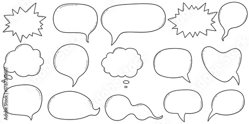Fototapeta premium Hand-drawn doodle set of empty speech bubbles on a white background.