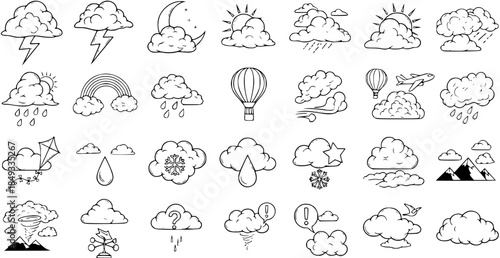 © kulinadsgn, Fototapeta premium Hand-Drawn Doodle Weather Icons Set: Outline Vector Collection of Sky Elements like Clouds, Sun, Rain, Snow, Lightning, Rainbow, and Tornado for Climate Forecast