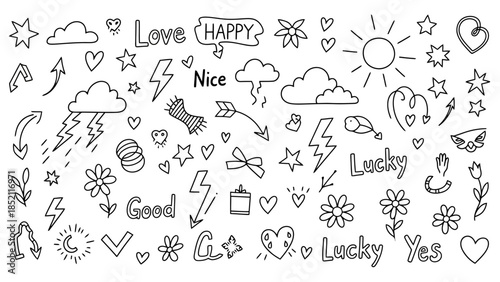 © Budi Studio, Obraz premium Hand Drawn Doodles Vector Illustration Set with Positive Words and Symbols