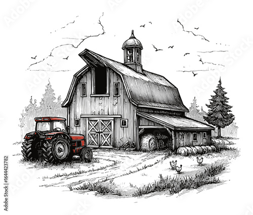 © Bandaro, Fototapeta premium Hand-Drawn Engraving of a Rustic Barn with Tractor and Farmyard Scene