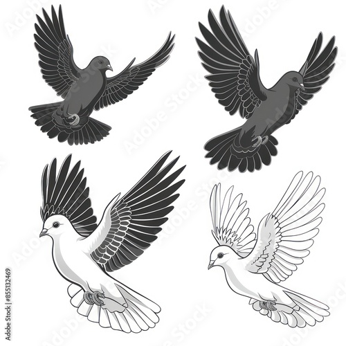 © Imsuniyah, Fototapeta premium Hand Drawn Engraving Pen and Ink White Dove Flying Vintage Vector Illustration