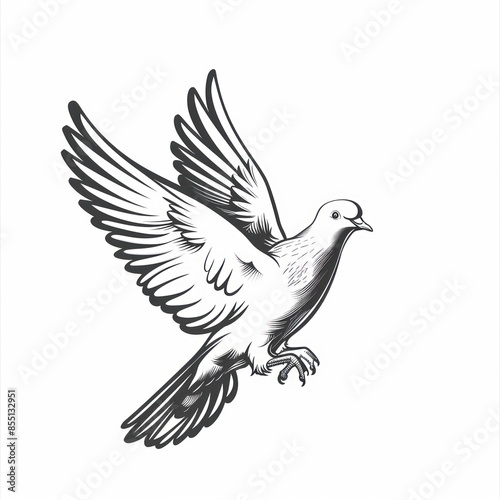 © Imsuniyah, Obraz premium Hand Drawn Engraving Pen and Ink White Dove Flying Vintage Vector Illustration