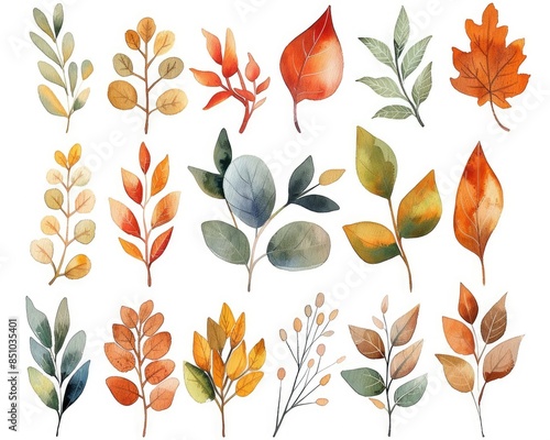 Obraz premium Hand Drawn Fall Leaves. Watercolor Botanical Clipart for Invitations and Prints