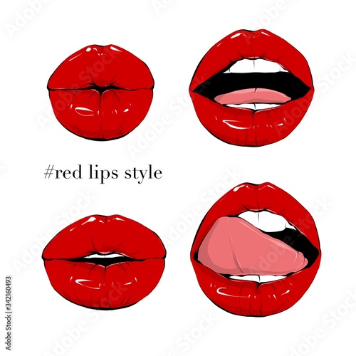 Obraz premium Hand drawn female lips. Close-up plump lips. Red kissing lips. Woman mouth with tongue.