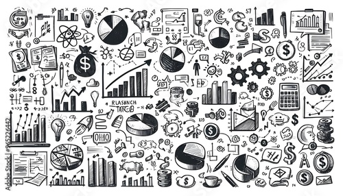 Fototapeta premium Hand-drawn financial and business icons, like graphs, pie charts, and currency symbols, scattered on a white background. Concept of business strategy and planning