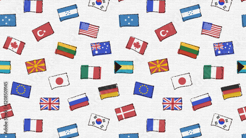 Fototapeta premium hand drawn flag motif seamless pattern on white background, vector graphic resources, 16:9 widescreen wallpaper / backdrop,