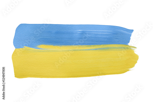 © Андрей Жерновой, Fototapeta premium Hand drawn flag of Ukraine. Yellow and blue strokes of paint on white isolated background. The national symbol of the country. Flag concept with colorful brush strokes. UA. Close-up macro shot.