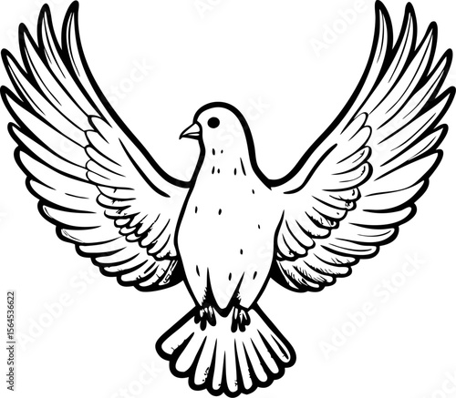 © Purple_Lamp, Fototapeta premium Hand drawn flying dove with open wings isolated on white background black and white vintage illustration