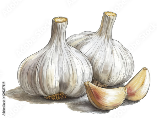 © Jan, Obraz premium Hand-drawn garlic bulbs with cloves. Transparent background.
