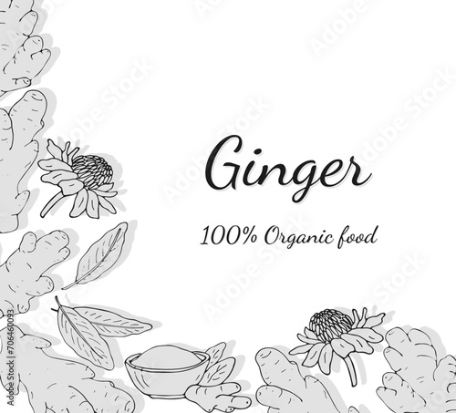 Fototapeta premium Hand-drawn ginger set. Ginger root banner. Ginger root, leaves, flowers, and powder in a bowl. Vector illustration, isolated on white background.