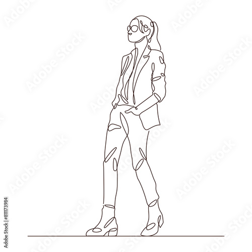 Fototapeta premium Hand drawn girl walking in a jacket and sunglasses one line drawing
