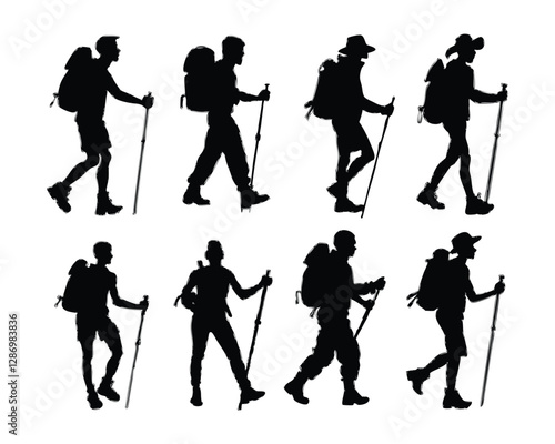 © Nadia01, Obraz premium Hand drawn hiking silhouette bundle set on a white background