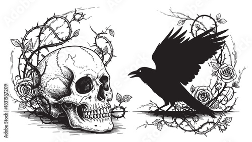 Naklejka premium Hand-drawn human skull and raven silhouette entwined with thorny rose vines...