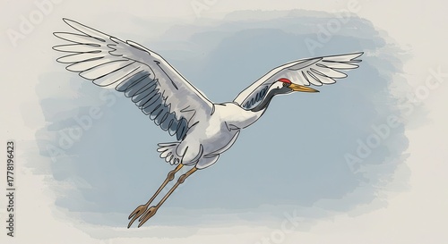 © Hungarian, Naklejka premium Hand drawn illustration depicts a majestic wading bird in graceful flight across a muted sky