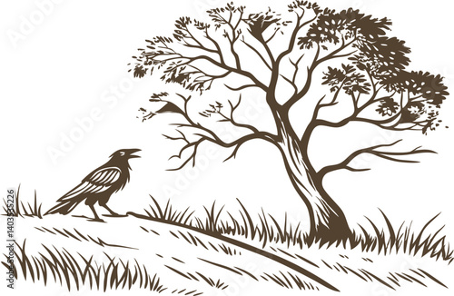 Obraz premium Hand-drawn illustration of a majestic eagle perched on a tree branch in a forest, symbolizing freedom, nature, and wildlife, perfect for nature-themed designs and wildlife art.