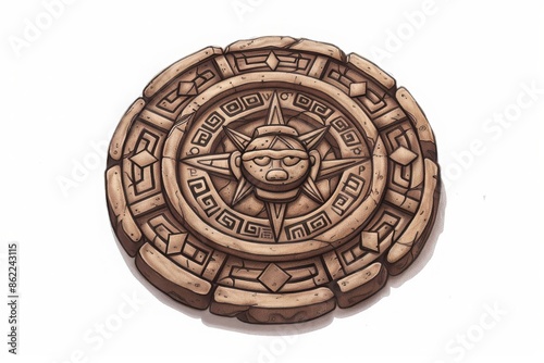 © CoreVisuals, Naklejka premium Hand-drawn illustration of an ancient Aztec calendar stone with intricate carvings and a sun motif, isolated on a white background.
