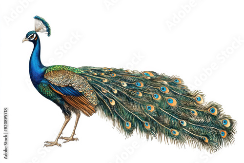 Obraz premium hand-drawn illustration of an exotic peacock displaying feathers, isolated on white background