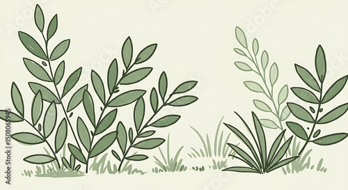 Naklejka premium Hand drawn illustration of green foliage leaves and grass nature botanical spring summer greenery