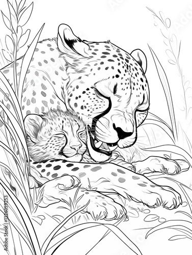 Fototapeta premium Hand drawn illustration of leopard and her cub. Black and white savannah...