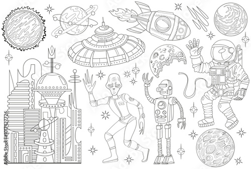 Fototapeta premium Hand drawn illustration with doodle set of retro future space planets and ships, rocket, spaceman, alien, robot and objects, line art science fiction concept