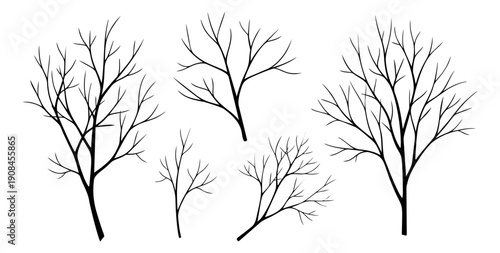 © NK, Obraz premium Hand drawn line art tree set featuring bare branches for winter nature design