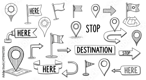 © Piyar, Naklejka premium Hand-drawn map location icons vector navigation elements for travel and destination concepts isolate