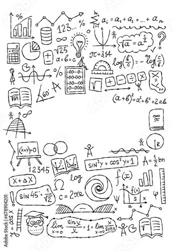 © Kudryashka, Fototapeta premium Hand drawn math science formulas on chalkboard background. Vertical frame with place for your text