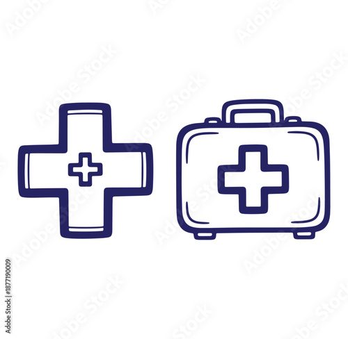 Fototapeta premium Hand-drawn medical icons featuring a plus sign symbol and a first aid kit...