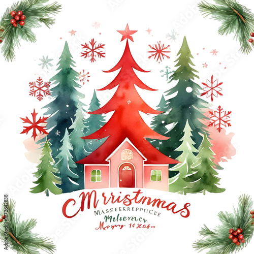 Fototapeta premium Hand-drawn Merry Christmas Trees with Snowflakes, Festive Holiday Design