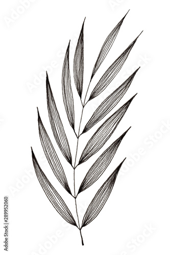 Obraz premium Hand drawn of leaf and foliage branch isolated on white background using black ink for design purpose