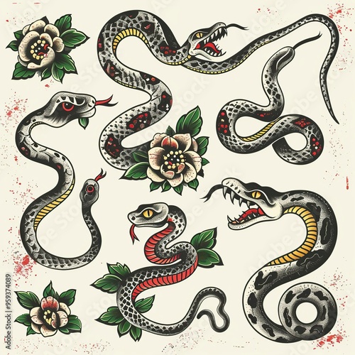 © CREATIVE STOCK, Obraz premium Hand drawn old school tattoo isolated icon of Snake vector image set
