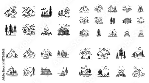 Fototapeta premium Hand-drawn outdoor and camping scene icons featuring mountains, cabins, pine...