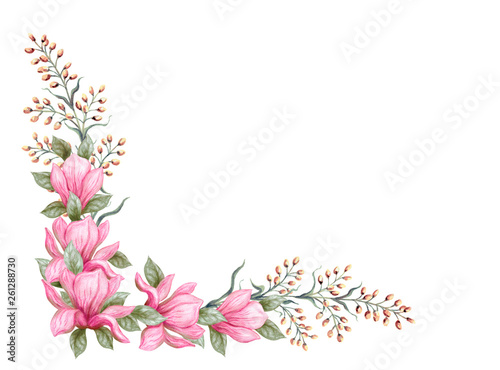 © Marisha, Naklejka premium Hand drawn painting watercolor pencils and paints pink magnolia flowers isolated on white background
