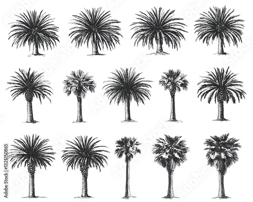 Fototapeta premium Hand-drawn palm trees in black and white. Background white. Use nature design