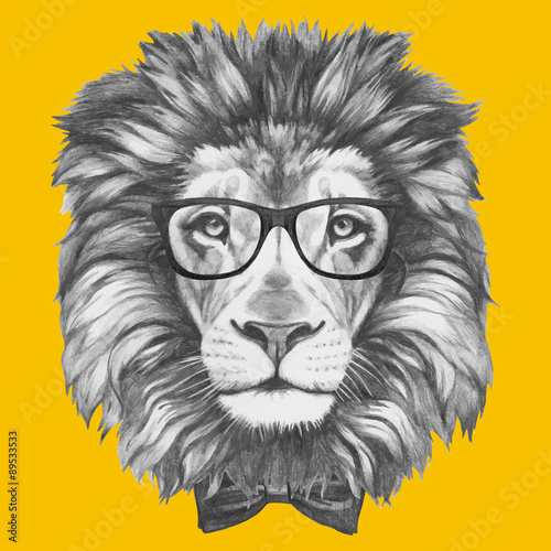 © Victoria Novak, Fototapeta premium Hand drawn portrait of Lion with glasses and bow tie. Vector isolated elements.