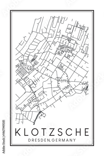 © Djerdj, Fototapeta premium Hand drawn printable downtown road map poster of borough KLOTZSCHE of the German city of DRESDEN on solid white background with city name