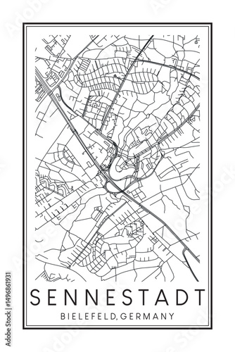 © Djerdj, Naklejka premium Hand drawn printable downtown road map poster of borough SENNESTADT of the German city of BIELEFELD on solid white background with city name