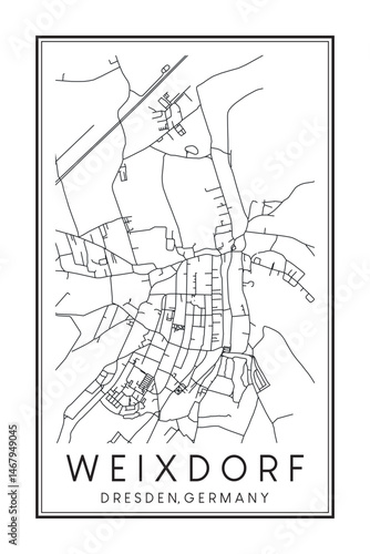 © Djerdj, Fototapeta premium Hand drawn printable downtown road map poster of borough WEIXDORF of the German city of DRESDEN on solid white background with city name