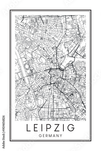 © Djerdj, Fototapeta premium Hand drawn printable downtown road map poster of the German city of LEIPZIG on solid white background with city name
