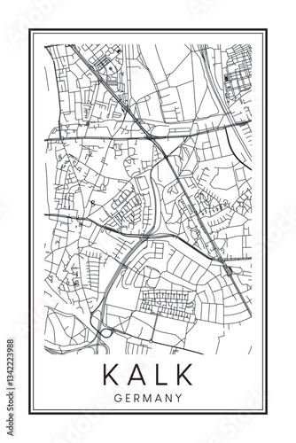 © Djerdj, Naklejka premium Hand drawn printable downtown road map poster of the German city quarter of COLOGNE-KALK on solid white background with city name