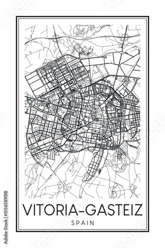 © Djerdj, Naklejka premium Hand drawn printable downtown road map poster of the Spanish city of VITORIA-GASTEIZ on solid white background with city name