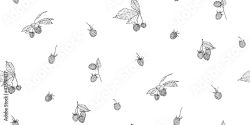 © Ekaterina, Fototapeta premium Hand drawn raspberry seamless pattern. Sketch style vector illustration. Black botanical endless backdrop on white background