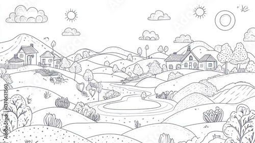 © Mundhut, Fototapeta premium Hand-drawn rural landscape with hills, houses, and a pond. Perfect for coloring books or educational materials
