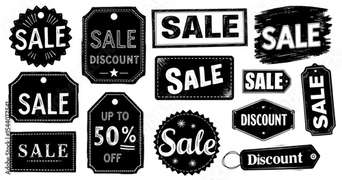 © Artem, Obraz premium Hand-drawn sale tags in a rustic black and white style for retail discounts